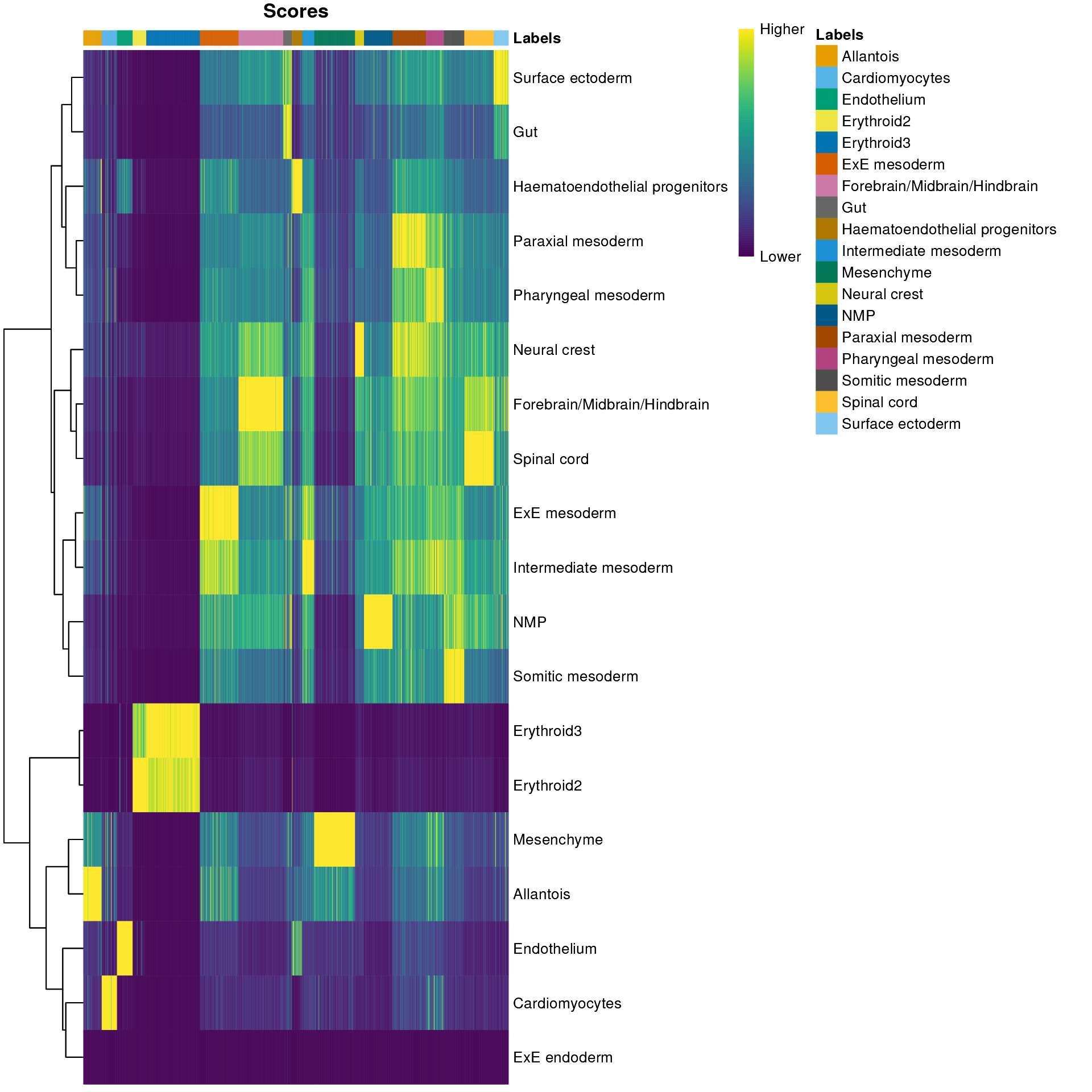 In this section, we will demonstrate the use of the SingleR method for cell type annotation Aran et al., 2019. This method assigns labels to cells based on the reference samples with the highest Spearman rank correlations, using only the marker genes between pairs of labels to focus on the relevant differences between cell types. It also performs a fine-tuning step for each cell where the correlations are recomputed with just the marker genes for the top-scoring labels. This aims to resolve any ambiguity between those labels by removing noise from irrelevant markers for other labels. Further details can be found in the SingleR book from which most of the examples here are derived.